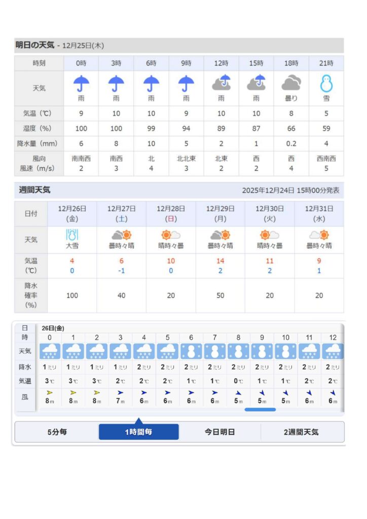 天気予報をいくつか見ますと26日は未明からずっと降り続くようですね。